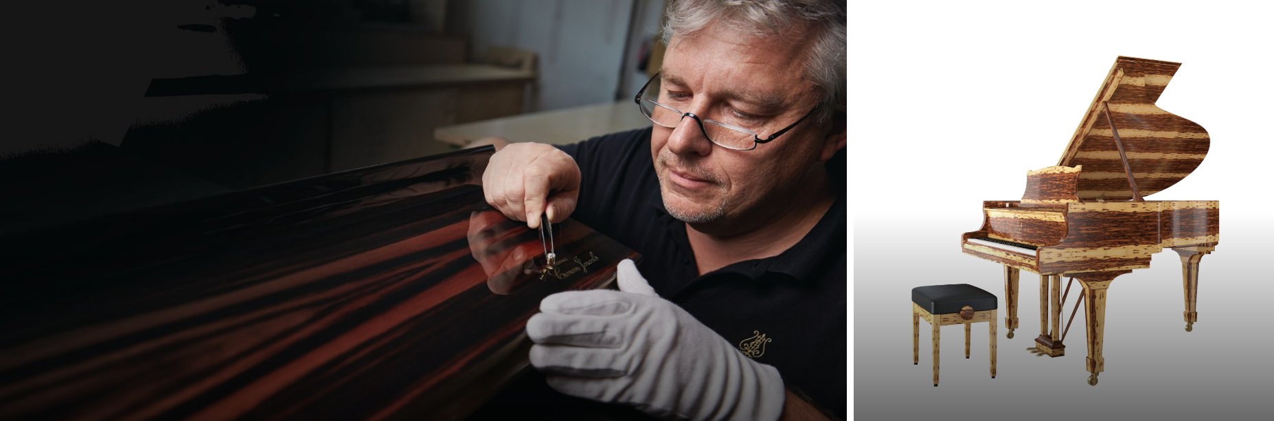 每一架施坦威皇冠珠寶系列鋼琴都是全球獨(dú)一無(wú)二的手工制作的藝術(shù)品?;使谥閷毾盗袖撉倏砂凑漳x擇的全球珍稀木材進(jìn)行裝飾,搭配精美的色彩和木紋。施坦威制琴師精心調(diào)制鋼琴一端至另一端的木紋,甚至包括琴蓋上的邊緣。尊貴獨(dú)享的特別限量版徽章更加彰顯獨(dú)特身份,感受真正的施坦威魅力。